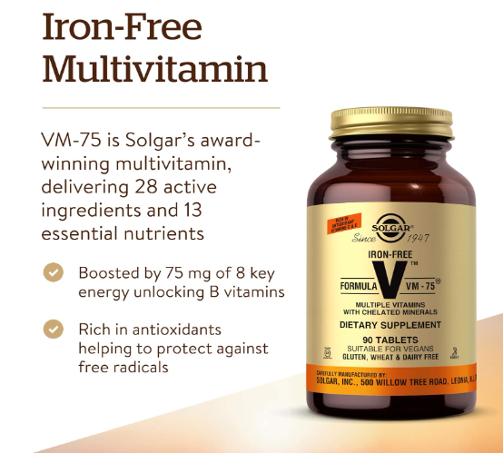 - Iron Free; This supplement is an iron-free version of Formula VM-75